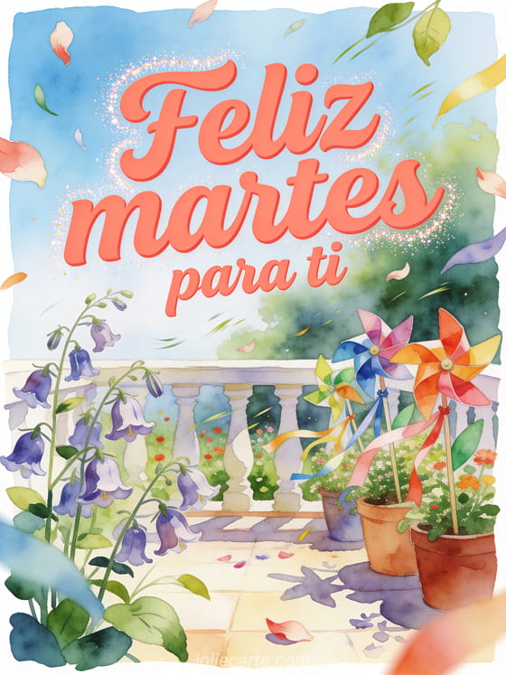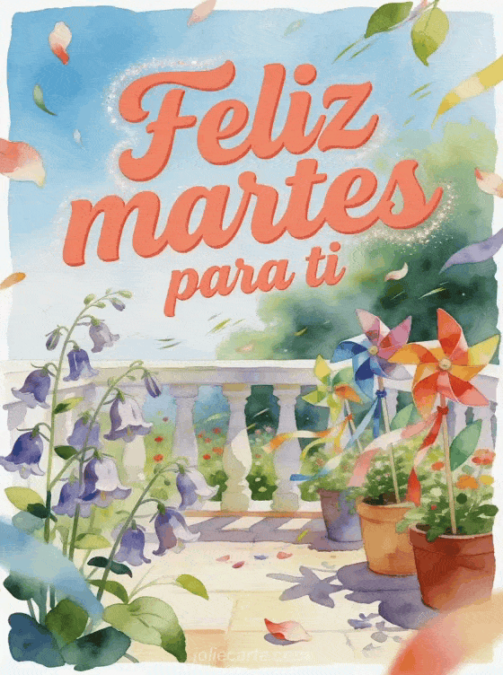 Envía una tarjeta de feliz martes con una terraza llena de campánulas, molinos de viento coloridos y cintas que se mueven con una energía luminosa. Descubre también un feliz martes al sol gifs, un buenos días feliz martes buen día besos o unas buenos días feliz martes imágenes.