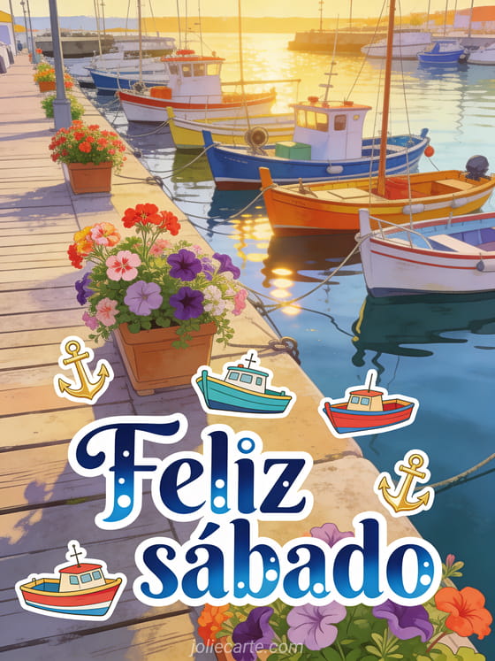 Compartan una tarjeta alegre de feliz sábado con letras azul marino, toques blancos, stickers de barcos coloridos y anclas doradas, un muelle florido, barcos pesqueros amarrados y jardineras llenas de geranios y petunias. Vean también feliz sábado a todos gif, esta imagen para feliz sábado o feliz sábado primaveral.