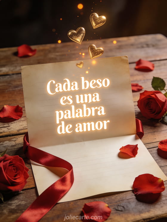 Comparte esta hermosa tarjeta romántica donde cada beso es una palabra de amor. Descubre también una tarjeta imagen besos de amor o una tarjeta besos del corazón.