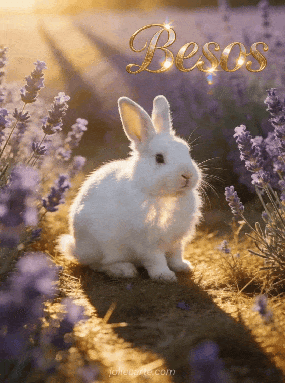 Comparta un tierno mensaje de besos con esta suave tarjeta que muestra un conejo blanco y esponjoso sentado en un campo de lavanda al atardecer. También puede descubrir besos gif, logos animados besos o gif conejo besitos.