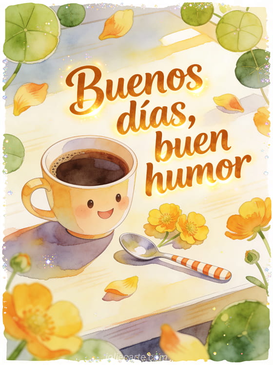 Empieza el día con una taza de café en acuarela, ranúnculos dorados y una cuchara rayada sobre una mesa soleada. También pueden enviar buenos días buen café de la mañana, una bonita imagen de buenos días con café o buenos días buen café.