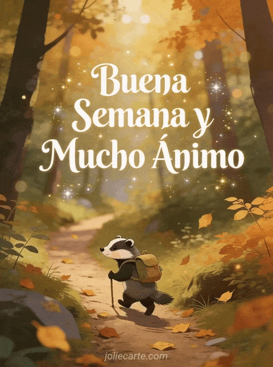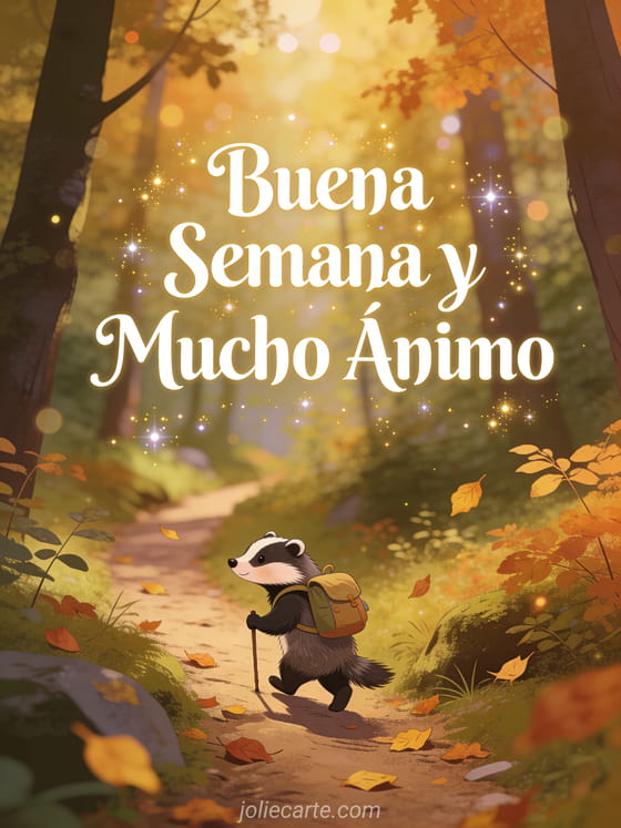 Levanta el ánimo de tus seres queridos con esta alentadora tarjeta con un pequeño tejón decidido caminando por un sendero del bosque con su mochila. Descubre también una tarjeta divertida de buena semana o una tarjeta de buenos días y buena semana.
