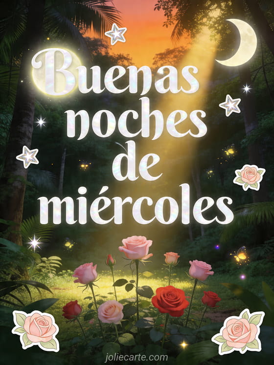 Comparte un encantador saludo de miércoles por la noche con un bosque frondoso, malvarrosas en flor y una luna creciente luminosa. Descubre también gif feliz miércoles besos, flores feliz miércoles imágenes y imagen miércoles buenos días.