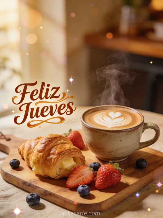 Comparte un acogedor saludo de jueves por la mañana con esta cálida tarjeta con un cappuccino con arte latte y un croissant mantecoso. Descubre también gif buen jueves soleado o imagen gratis feliz jueves besos para más inspiración del jueves.