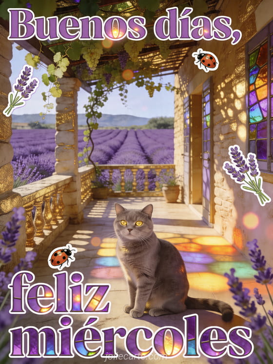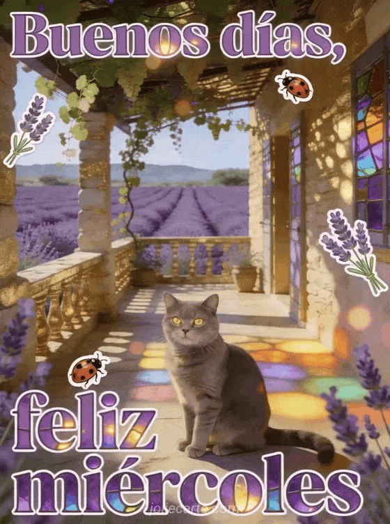 Comparte un hermoso saludo de miércoles por la mañana con campos de lavanda, un mas provenzal y un elegante gato cartujo. Descubre también picmix feliz miércoles imágenes, imagen gif animado feliz miércoles y ternura imagen feliz miércoles besos.