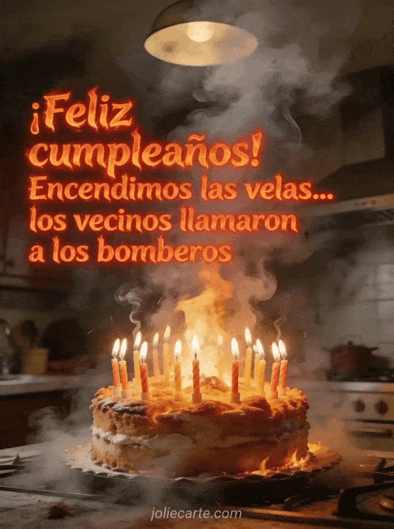 Envía esta imagen de cumpleaños con humor con un pastel tan lleno de velas que parece una hoguera con humo subiendo hasta el techo. Descubre también una frase cumpleaños humor o un texto gracioso de cumpleaños.