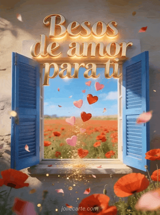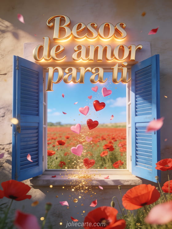 Envía esta romántica tarjeta con las palabras Besos de amor para ti escritas en letras doradas con luz cálida, con una ventana abierta con contraventanas azules que da a un campo de amapolas rojas en verano, con corazones rosas y rojos flotando hacia el campo. Descubre también una buenos días besos enamorados o una besos de todo corazón imagen.