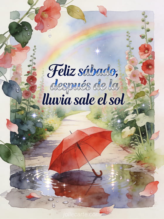 Comparte un mensaje esperanzador de sábado con una tarjeta en acuarela con un camino de jardín, un paraguas rojo, charcos brillantes, malvarrosas y un suave arcoíris. También pueden enviar una muy bonita imagen feliz sábado, compartir feliz sábado besos gifs o elegir buenos días sábado imagen.