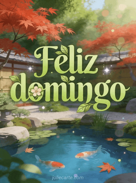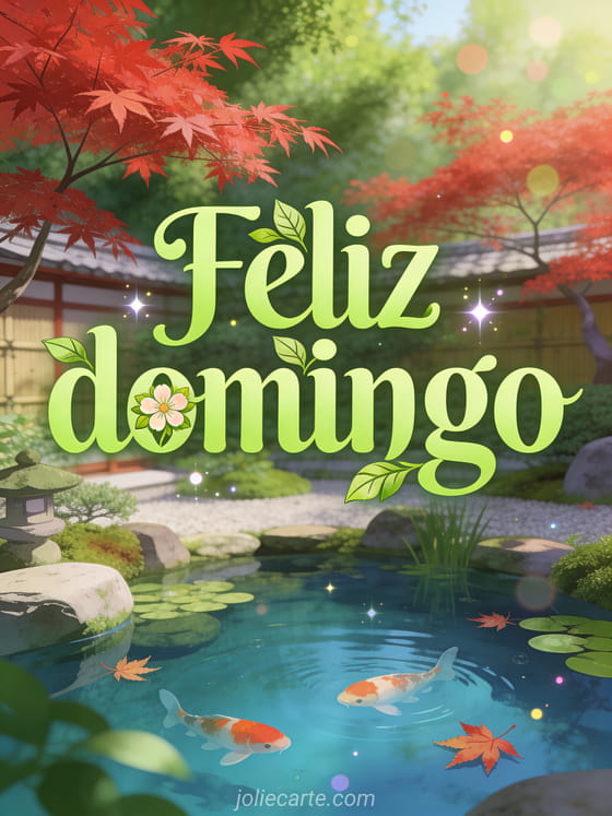 Comparte un saludo relajante de feliz domingo con escritura verde manzana, un jardín japonés sereno, un estanque koi y un arce rojo en ambiente zen. Descubre también una tarjeta de feliz domingo en familia, una imagen de buenos días domingo o una tarjeta de feliz domingo mi amor con besos.