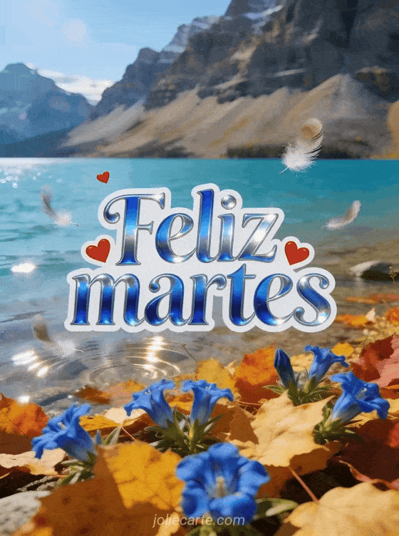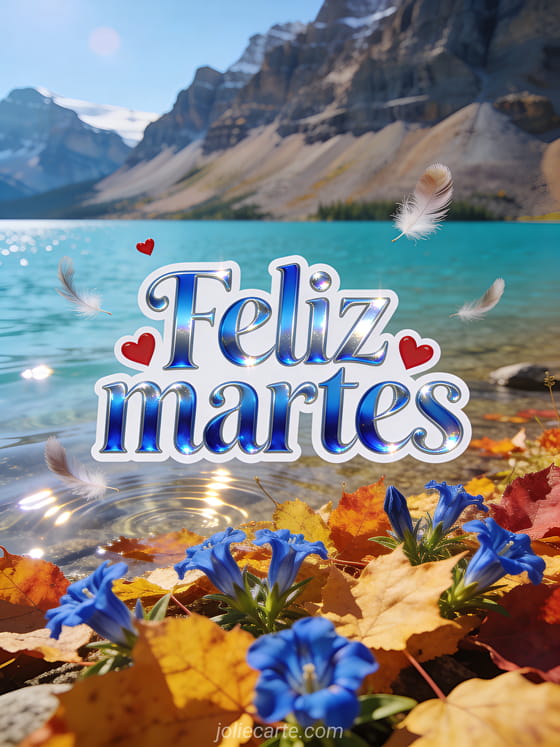 Envía una imagen de feliz martes besos con letras azul genciana, corazones rojos, plumas delicadas y el lago Moraine brillando con luz cálida de otoño. Comparte un deseo romántico entre semana y descubre también feliz martes humor imagen, feliz martes tarjeta virtual o buenos días feliz martes imagen.