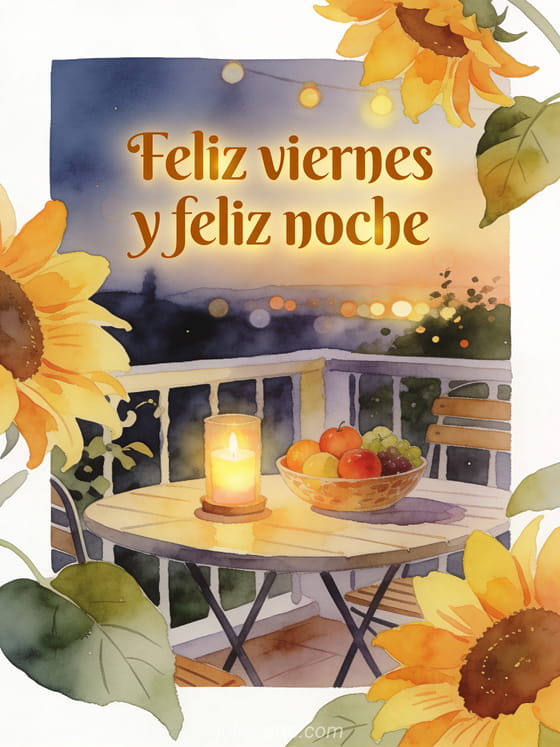 Compartan un mensaje feliz de fin del día con pétalos de girasol, una mesa de patio acogedora, una vela encendida, un tazón de frutas maduras y luces cálidas de la tarde en acuarela. Descubran también imagen feliz viernes y buen fin de semana, feliz viernes tarjetas o texto para desear un feliz viernes.