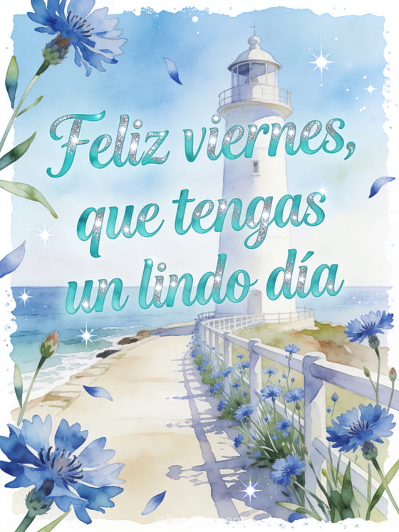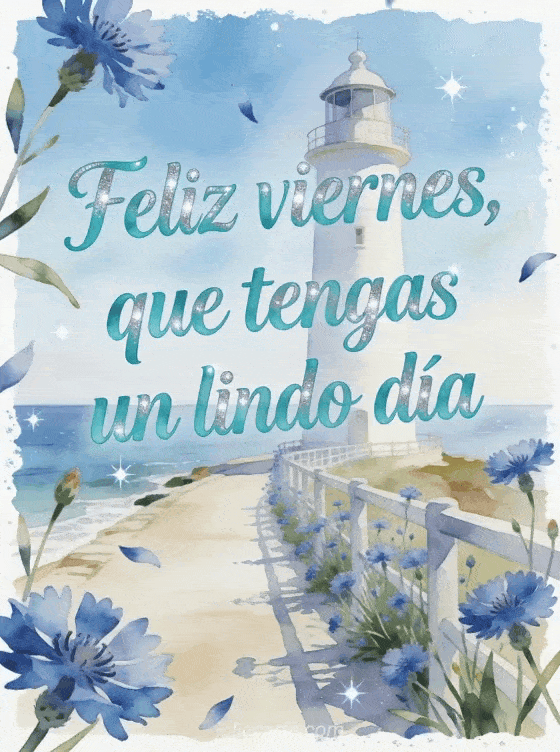 Comparte un saludo luminoso de viernes con letras turquesa, un camino junto al mar, un faro blanco, acianos azules y detalles de agua brillante. Descubre también imágenes de feliz viernes besos, un gif feliz viernes frío o un besos de viernes gif.