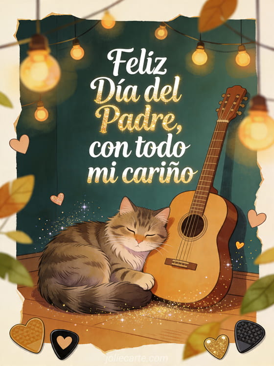 Envíen una imagen tierna del Día del Padre con una ilustración acogedora de cuento: un gato noruego acurrucado junto a una guitarra acústica bajo luces cálidas, pequeños corazones y formas de hojas. Vean también un poema del Día del Padre, poesía feliz Día del Padre papá bondad y ternura o dibujo feliz día del padre papá.