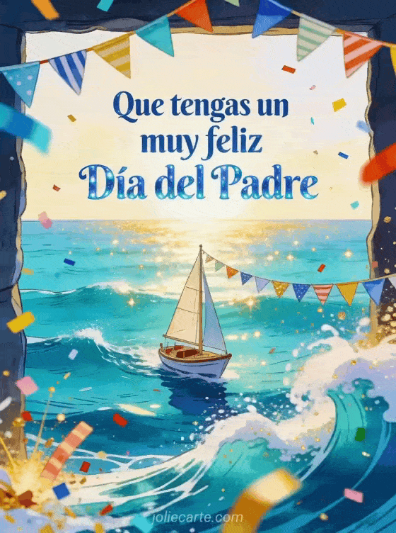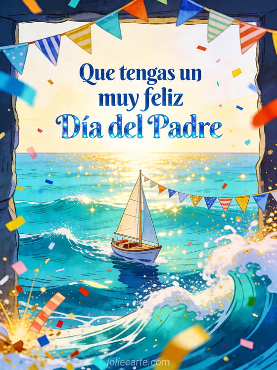 Comparte una imagen Día del Padre soleada con un pequeño velero cruzando una bahía turquesa, banderines festivos, olas brillantes y confeti alegre. Descubre también una tarjeta camisa del Día del Padre.