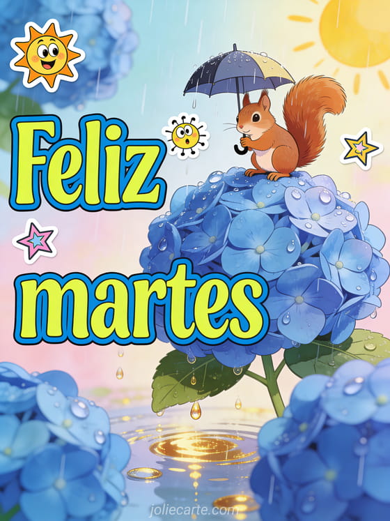 Envía un saludo divertido de feliz martes con letras amarillo limón estilo cómic, soles y estrellas juguetones, hortensias azules con rocío y una ardilla sobre una flor con un paraguas diminuto bajo un sol radiante. También pueden ver esta feliz martes imagen, esta buenos días martes tarjeta o esta imagen gratis de feliz martes besos.