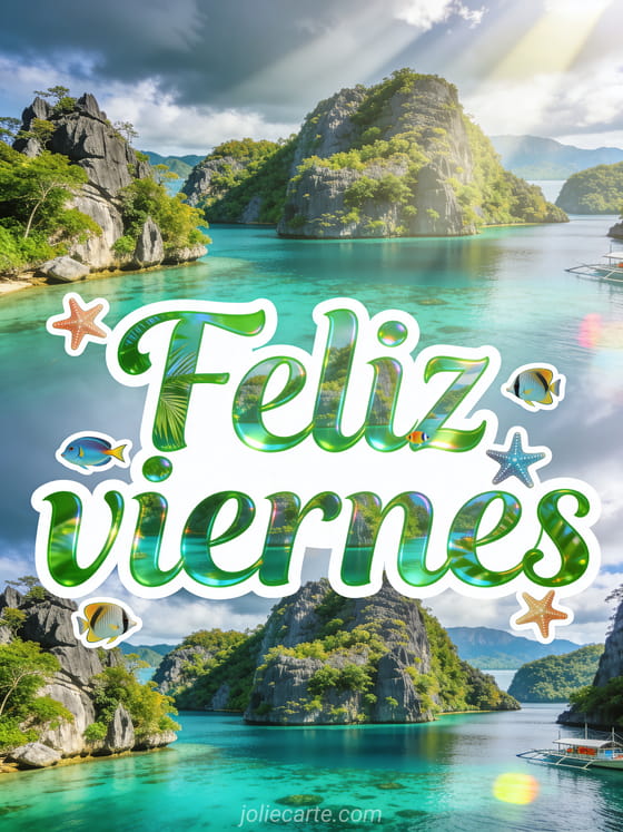 Envía una imagen divertida de feliz viernes humor con letras verdes tropicales, pececitos, estrellas de mar y los lagos ocultos de Coron en Palawan. Comparte un deseo alegre de fin de semana y descubre también feliz viernes corazón, buenos días hermoso día de viernes o buenos días viernes humor divertido.