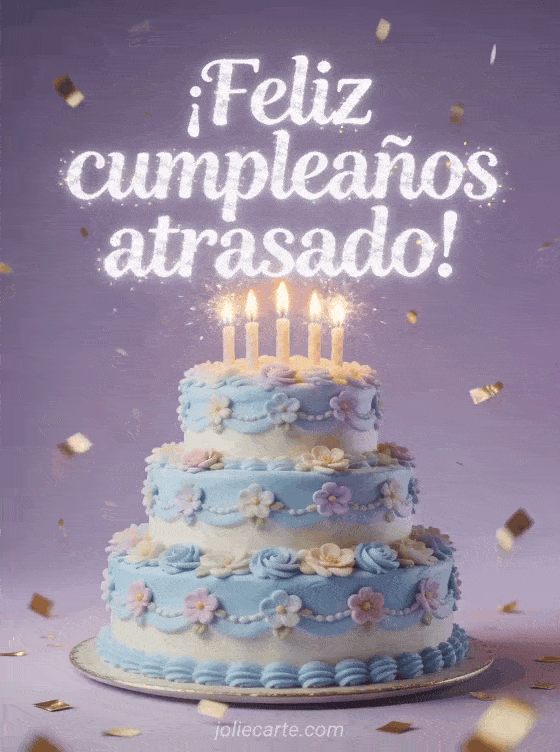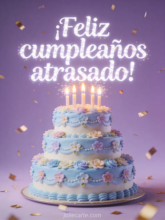 Envía un alegre feliz cumpleaños atrasado con esta tarjeta festiva con pastel, velas y confeti. Descubre también una tarjeta de cumpleaños atrasado divertida o una tarjeta de cumpleaños atrasado con disculpa.