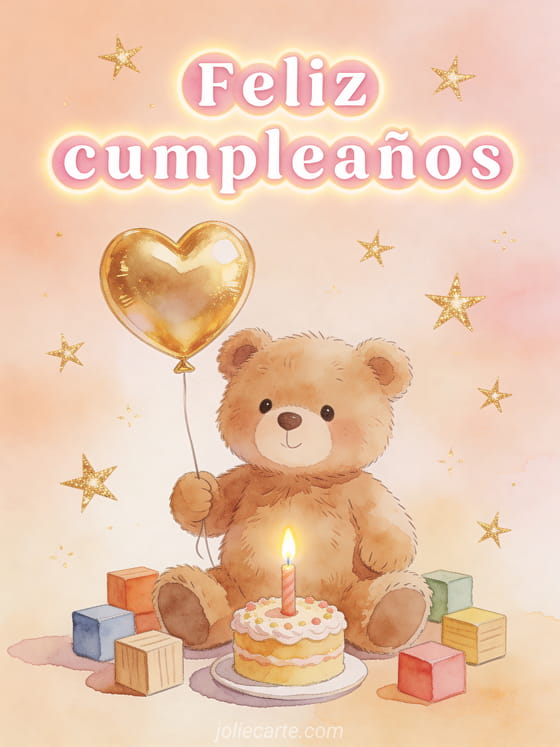 Envía esta adorable tarjeta de cumpleaños con un dulce osito de peluche sosteniendo un globo dorado en forma de corazón rodeado de cubos de madera coloridos y un pastelito con una vela. Una forma tierna de celebrar el cumpleaños de un bebé. Descubre también una tarjeta de fiesta de cumpleaños al aire libre o una tarjeta de cumpleaños graciosa para niños.