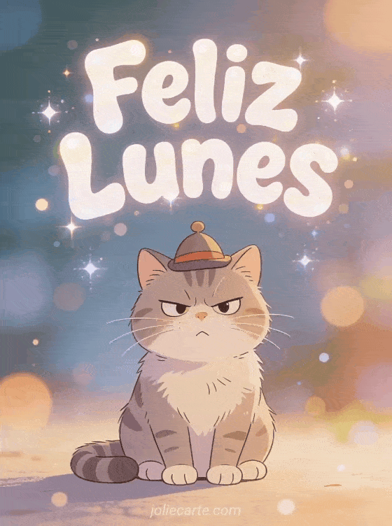Comparte una hilarante imagen de feliz lunes con un gato gruñón con sombrero pequeño. La tarjeta perfecta para empezar la semana con una carcajada. Descubre también una tarjeta feliz lunes imagen o una tarjeta feliz lunes humor besos.