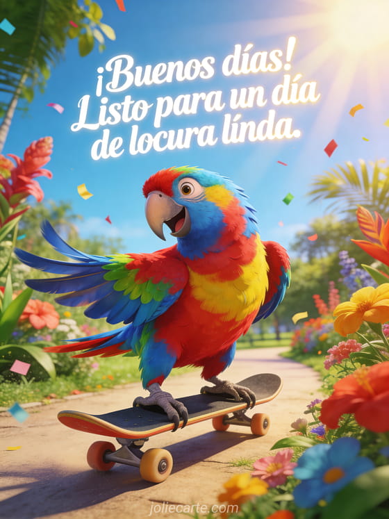 Empieza el día con energía con esta imagen graciosa de buenos días con un guacamayo en patineta. Mira también gif buenos días humor gratis o gif buenos días gracioso.