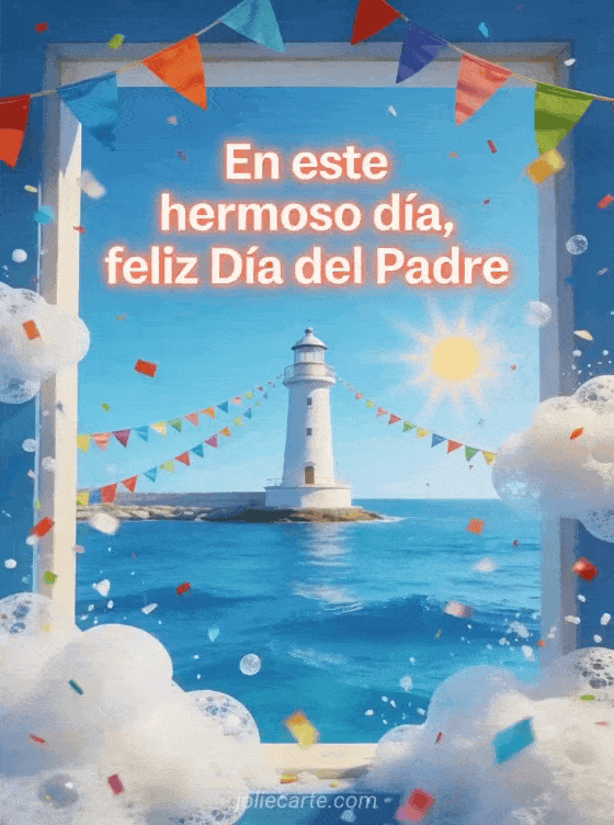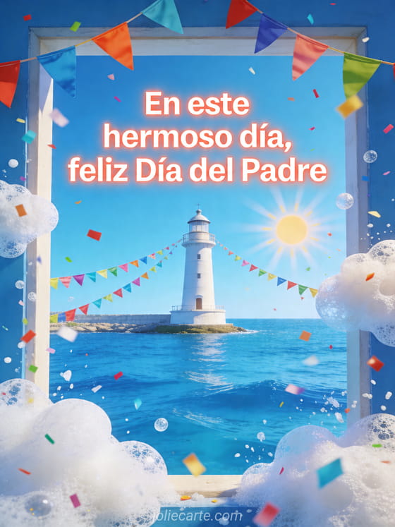 Envía una imagen gratuita Día del Padre con letras coral limpias, un faro blanco sobre un mar azul brillante, banderas de colores, rayos de sol, espuma marina y confeti alegre. Descubre también una tarjeta feliz Día del Padre, feliz día del padre mi amor o un modelo de tarjeta para Día del Padre.