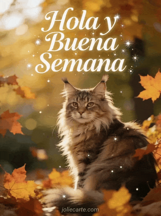 Desea una semana serena con esta tarjeta elegante que muestra a un majestuoso gato Maine Coon entre hojas de arce otoñales con luz dorada de la tarde. También pueden descubrir buena semana gif animado gif, semana tranquila o feliz semana humorística.