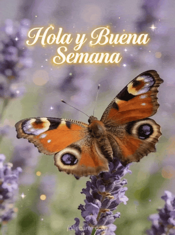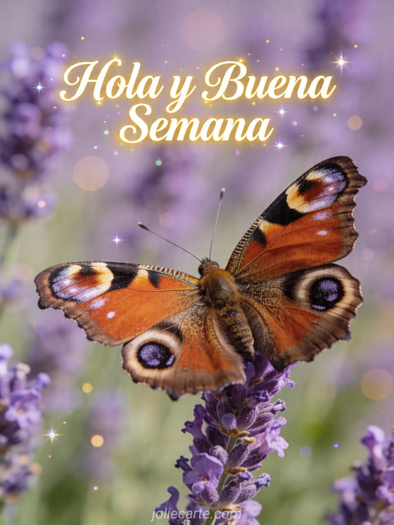 Comparte un suave Hola y buena semana con esta tarjeta gratis que muestra una mariposa posada sobre una rama de lavanda en un jardín de verano. También puedes descubrir buen día y buena semana, semana soleada o frase feliz semana.