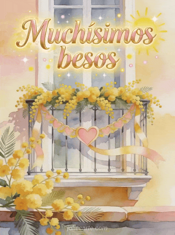 Comparte muchísimos besos con una tarjeta de acuarela luminosa, llena de letras doradas y rosadas, flores de mimosa y una guirnalda de cinta en forma de corazón. Descubre también una tarjeta de besitos, besos mi corazón gif o dibujo de besitos.