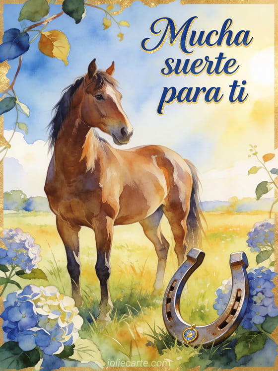 Envía mucha suerte para ti con caligrafía azul profundo, un caballo castaño en una pradera luminosa, una herradura de la suerte y hortensias cruzando el borde. Descubre también buena suerte ánimo gif, una tarjeta de buena suerte gratis o tarjeta de mucha suerte.