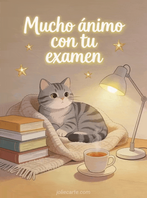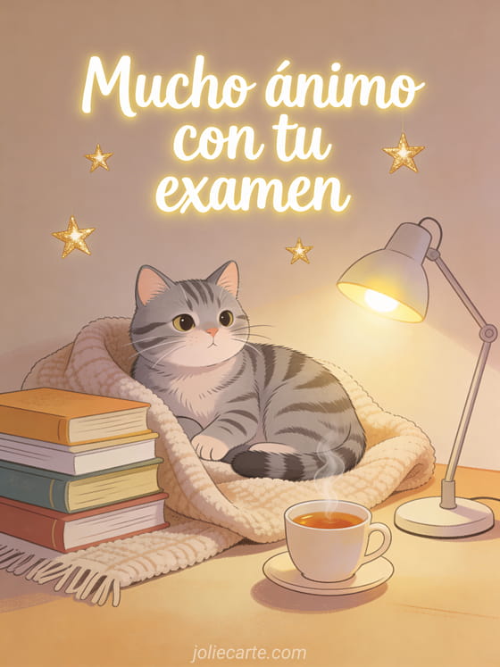 Alegra la preparación de un examen con esta adorable tarjeta con un gato atigrado acurrucado junto a libros y una taza de té humeante. Descubre también una tarjeta animada ánimo examen.