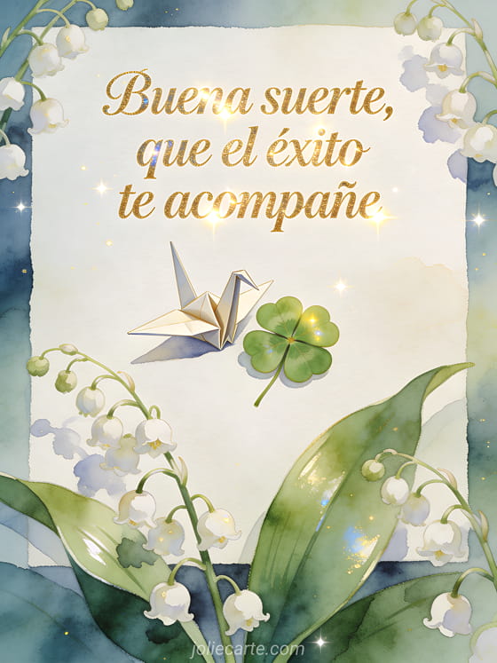 Comparte una imagen para decir buena suerte con una grulla de origami plegada, un trébol luminoso y tallos de lirio de los valles en una acuarela tranquila. Descubre también un texto para desear buena suerte en un examen, buena suerte gifs animados o un mensaje de buena suerte para un concurso.