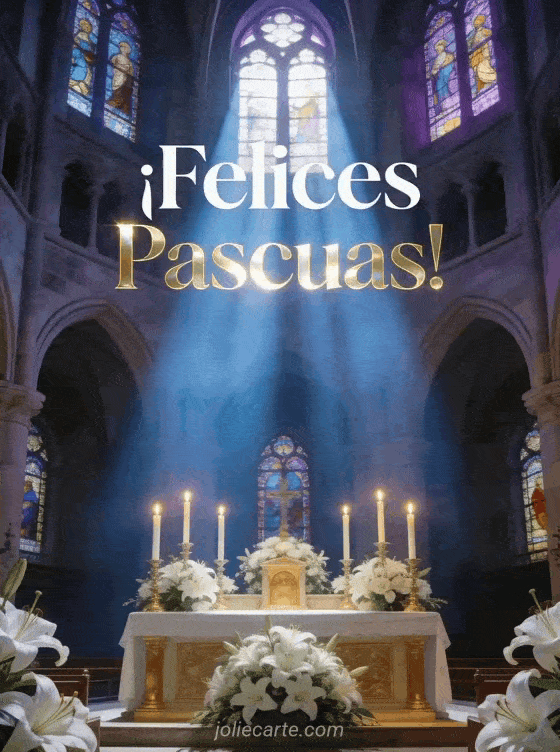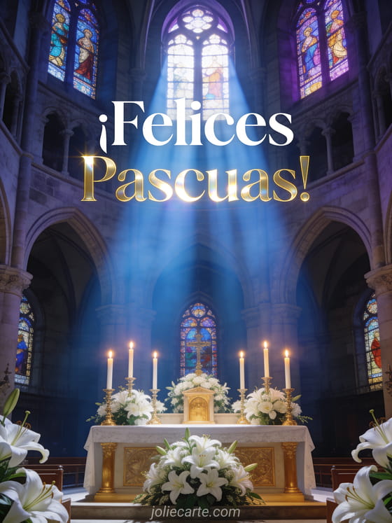 Celebra la Pascua con esta hermosa tarjeta católica con un majestuoso interior de catedral, vitrales iluminados y lirios blancos. Descubre también una tarjeta de Pascua religiosa, imagen de Pascua cristiana o felicitación de Pascua católica.