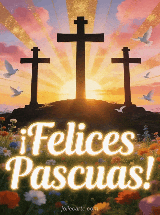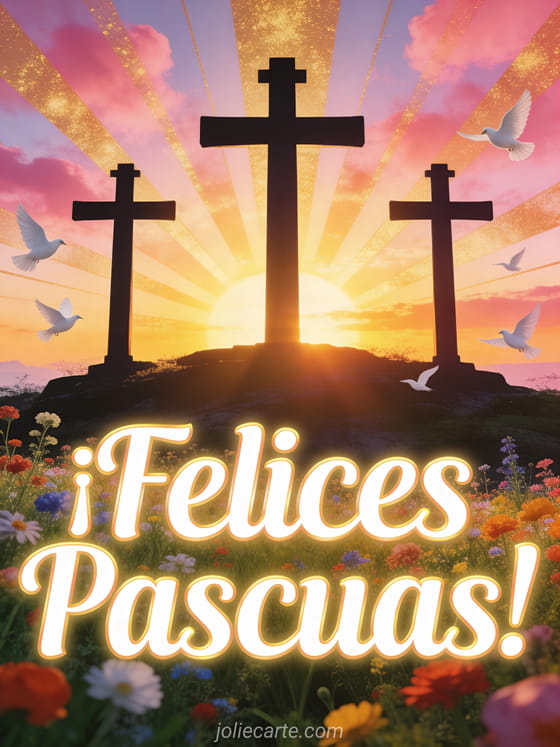 Celebra la Pascua con esta inspiradora tarjeta religiosa con tres cruces en el Calvario contra un glorioso amanecer, palomas blancas y flores silvestres. Descubre también una imagen de Pascua católica, imagen de Pascua cristiana o felicitación de Pascua católica.