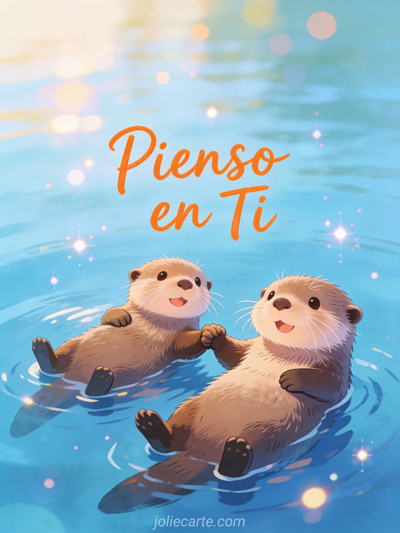 Envía una tierna tarjeta pienso en ti con dos nutrias adorables tomadas de la mano en agua tranquila. Descubre también una tarjeta divertida pienso en ti o una tarjeta mensaje pienso en ti.