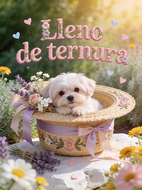 Envíen un mensaje suave y cariñoso con esta tarjeta gratis de ternura con un perro bichon frisé, lavanda y un ambiente de jardín soleado. Descubran también ternura abrazo, un abrazo para ti mi amor o abrazo pareja enamorada dormir.