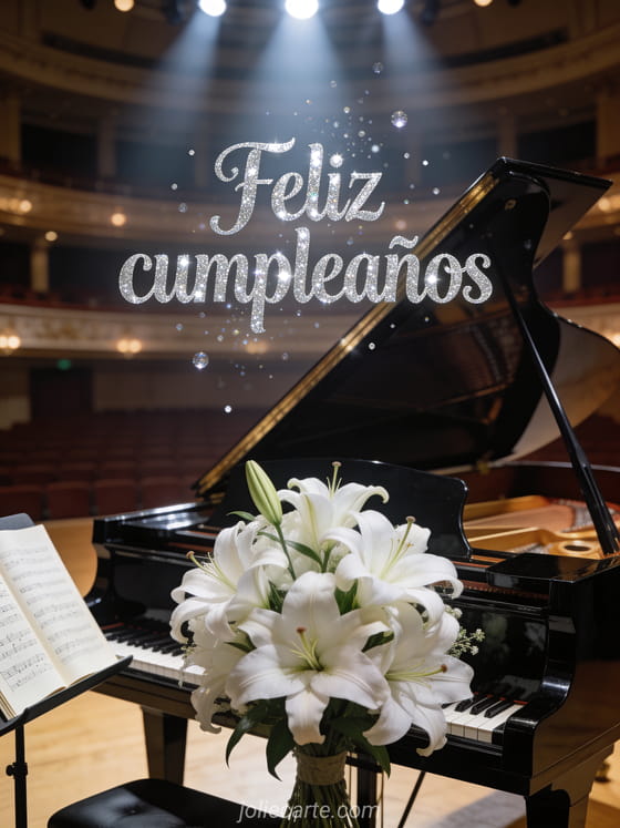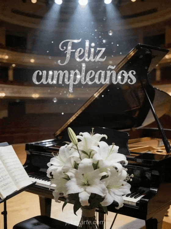 Esta espectacular tarjeta de cumpleaños animada para hombres muestra un gran piano de cola lacado en negro con la tapa abierta, un ramo de lirios blancos encima, partituras abiertas y una suave luz de foco en una sala de conciertos. Una tarjeta prestigiosa y musical para celebrar el cumpleaños de cualquier hombre con estilo. Descubre también un gif de cumpleaños gracioso para hombre o una bonita tarjeta animada de cumpleaños para hombre gratis.