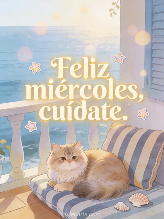 Feliz miércoles, cuídate. un mensaje tierno de mitad de semana con aire costero