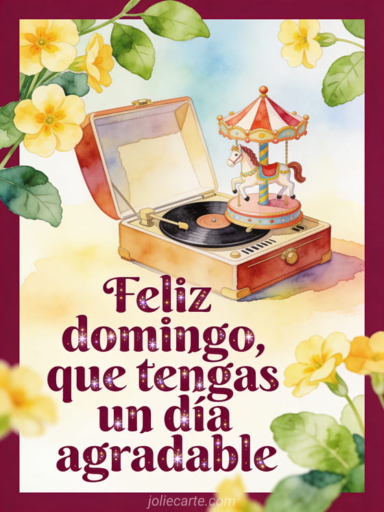 Desea feliz domingo, que tengas un día agradable con letras ciruela, una caja de música abierta, un pequeño caballo de carrusel y prímulas sobre el borde. Descubre también feliz domingo cálido imagen, feliz domingo imagen gif o feliz domingo texto.
