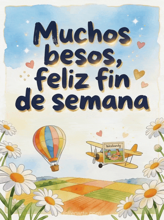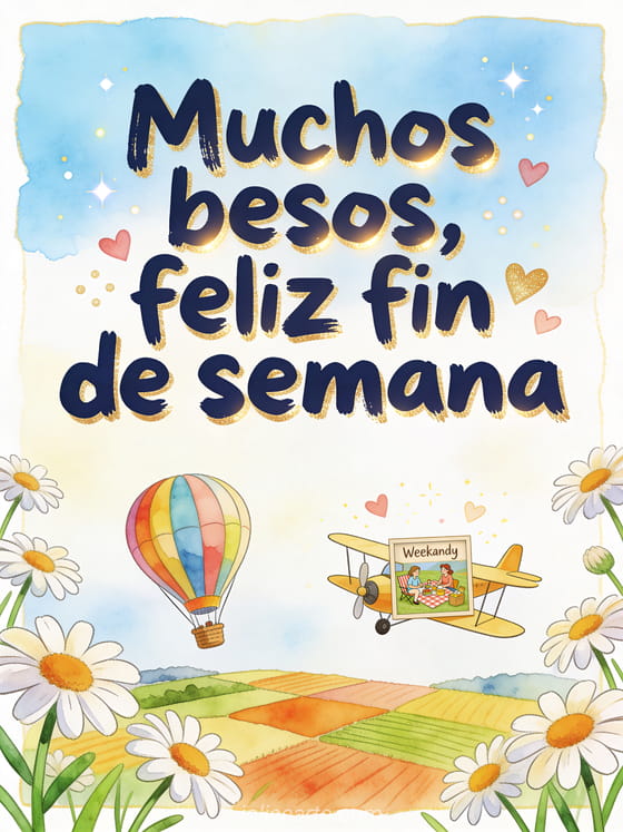 Compartan un ánimo feliz de fin de semana con letras azul marino, margaritas que salen del borde y un globo aerostático colorido sobre campos de retazos. También pueden enviar besos imágenes bonitas feliz fin de semana, feliz fin de semana y besos imagen o beso grande buen fin de semana besos.
