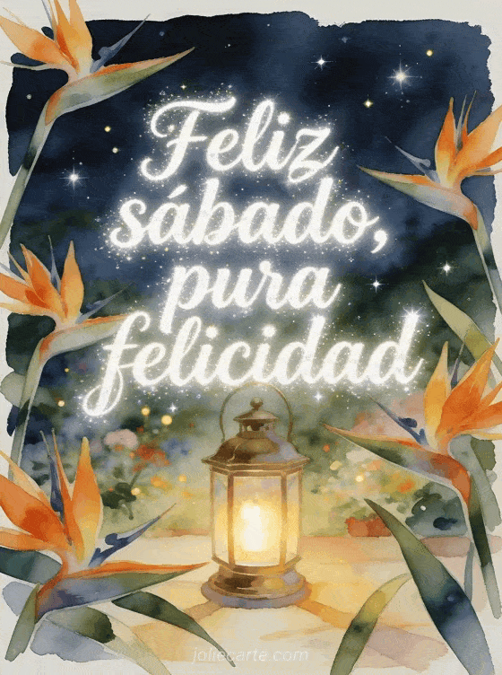Compartan un mensaje alegre de feliz sábado con una linterna de latón brillando entre flores ave del paraíso bajo pequeñas luces como estrellas. Descubran también imagen para desear un feliz sábado, feliz sábado gifs brillantes o feliz sábado soleado gif.