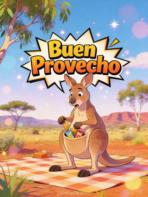 Comparte una carcajada con esta divertida tarjeta de buen provecho con un canguro en una picnic sorpresa. Descubre también una tarjeta buen provecho imágenes o una tarjeta almuerzo buen provecho.