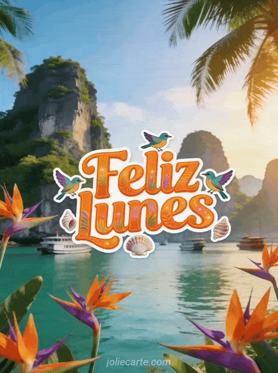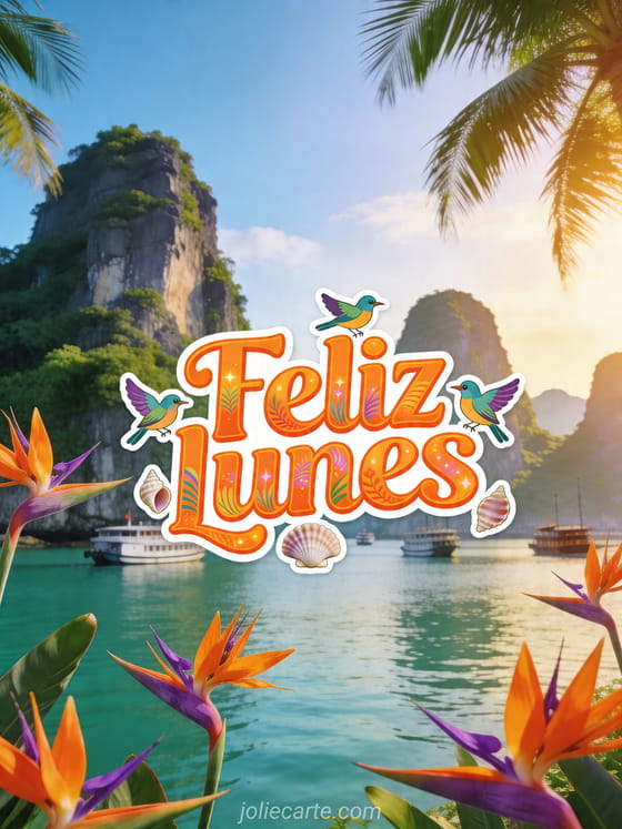 Comparte un radiante Feliz lunes con la bahía de Ha Long, flores tropicales y cálida luz de la mañana. Descubre también feliz lunes foto, imagen para decir feliz lunes y tarjeta buen día lunes.
