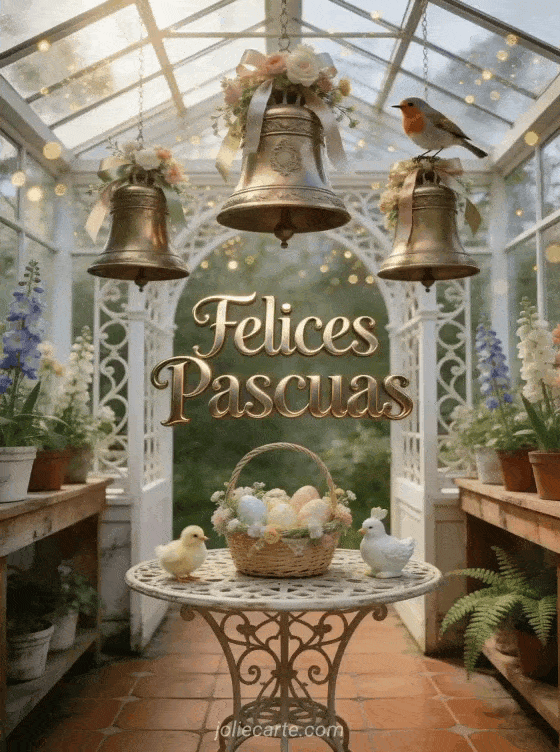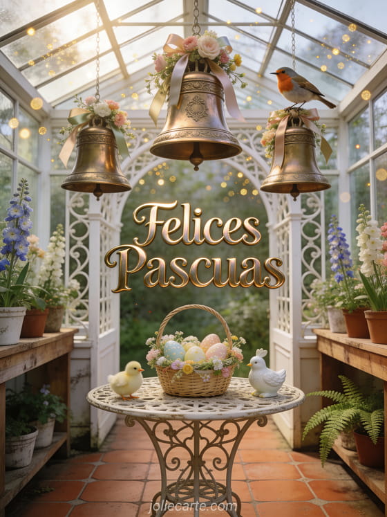 Envíe esta magnífica imagen de campanas de Pascua colgando en un invernadero victoriano decorado con flores primaverales y un encantador petirrojo. Descubra también una tarjeta de Pascua gratuita, una tarjeta de felicitación de Pascua o una imagen de felices Pascuas.