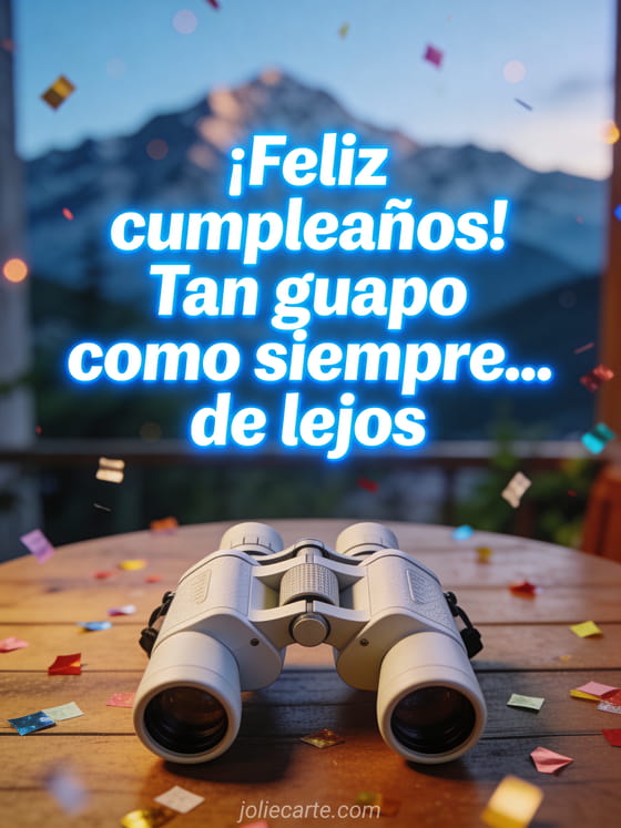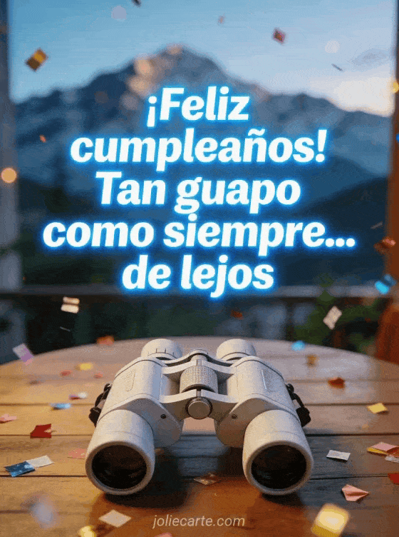 Compartan esta tarjeta humorística con binoculares, confeti disperso y fondo de montaña desenfocado para una felicitación con picardía. También pueden ver mensaje cumpleaños gracioso, hombre gif cumpleaños humor y feliz cumpleaños gracioso.