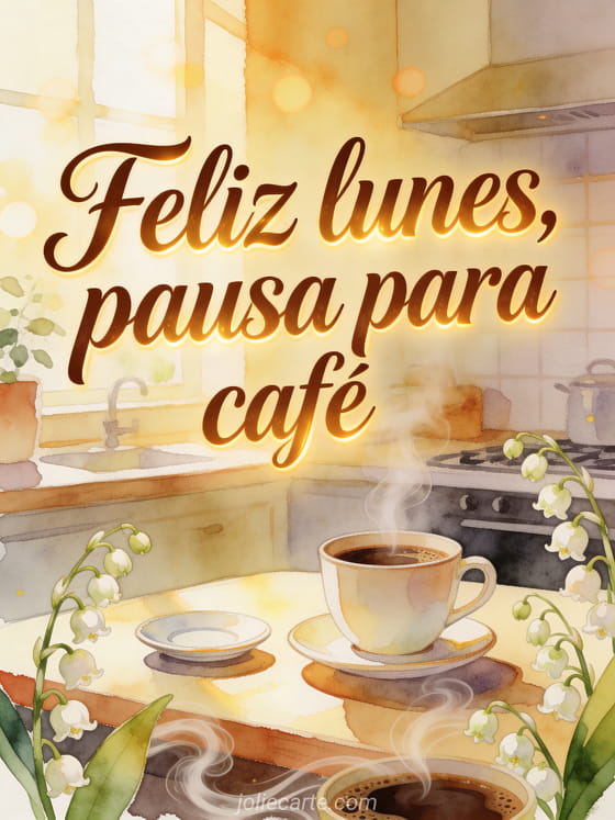 Empieza el lunes con un saludo acogedor de café, letras color moca, una taza humeante, tallos de lirio de los valles, un platillo y luz cálida de cocina. Descubre también un buenos días lunes gif animado, feliz lunes con lluvia imágenes o un feliz lunes gato gif.