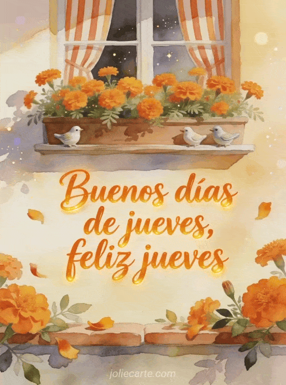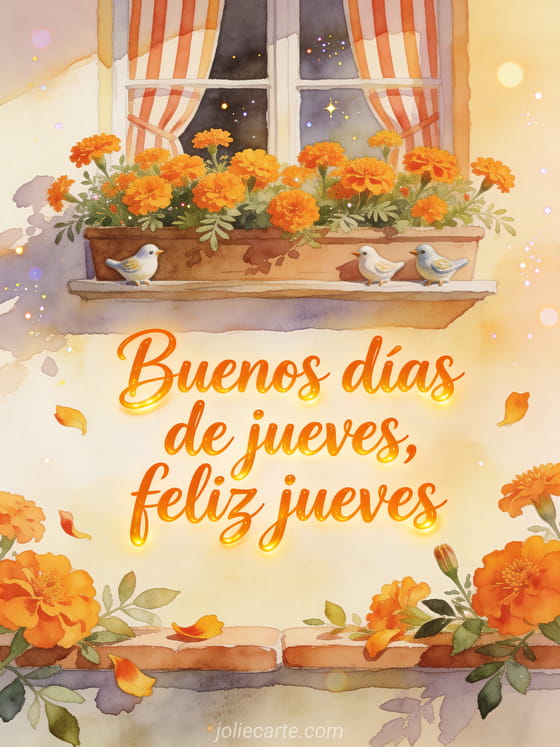 Comparte buenos días de jueves, feliz jueves con caligrafía naranja, una jardinera de ventana de cabaña llena de caléndulas, cortinas a rayas y pequeños pájaros de cerámica. Descubre también feliz jueves besos imágenes, buenos días feliz jueves paisaje o lindo jueves besos.