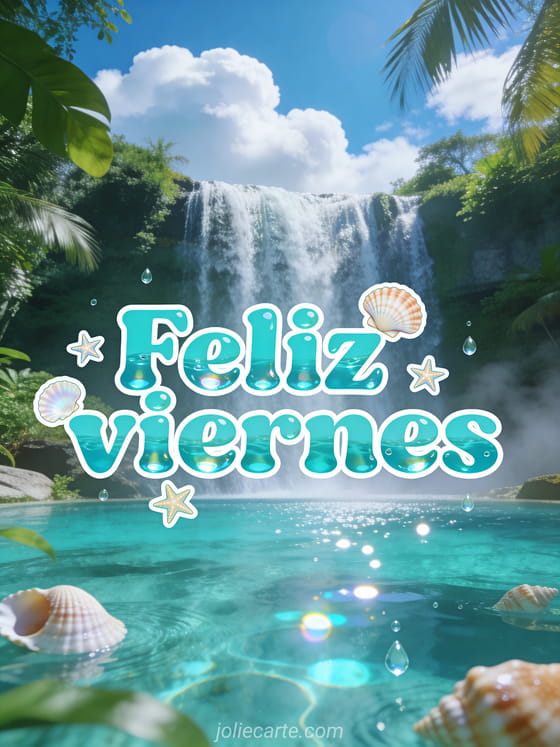 Compartan una tarjeta exuberante de feliz viernes con letras redondeadas turquesa, reflejos de agua, conchas, pequeñas estrellas de mar, una cascada majestuosa cayendo en una piscina natural esmeralda, cielo azul brillante, nubes blancas algodonosas y vegetación tropical. Vean también feliz viernes buen fin de semana humor, feliz viernes café imagen o mensaje para desear feliz viernes a los musulmanes.