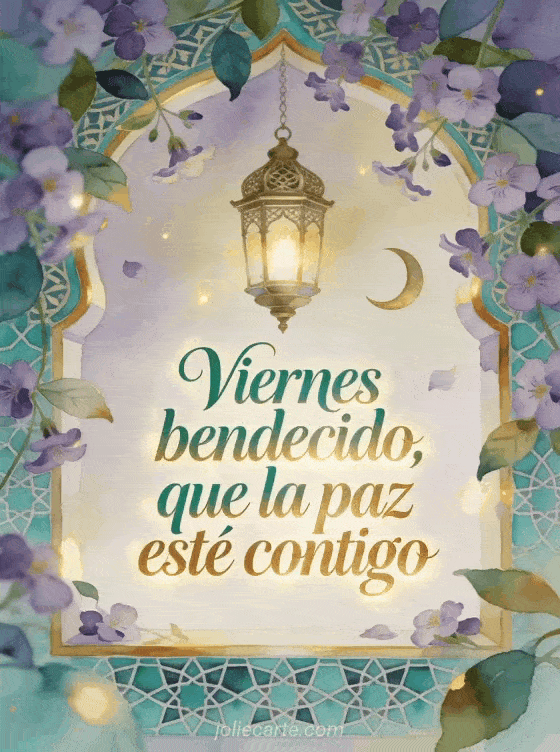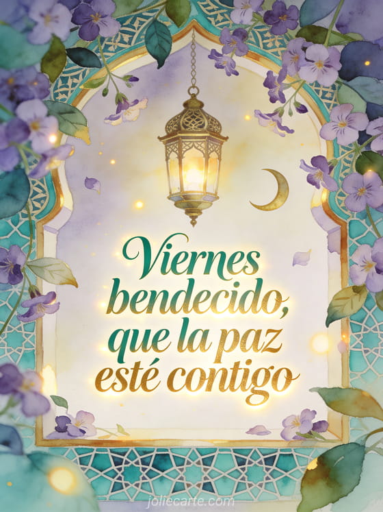 Envía un deseo de viernes bendecido con caligrafía verde esmeralda y dorada, flores de aubrieta, una linterna ornamentada, un motivo de luna creciente y azulejos turquesa. Descubre también imágenes deseando un feliz viernes, una feliz viernes imagen gratis o feliz viernes con imagen.
