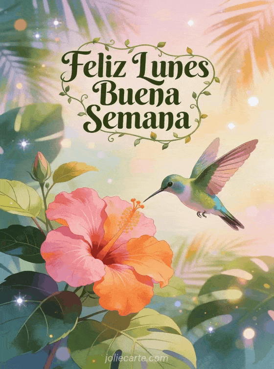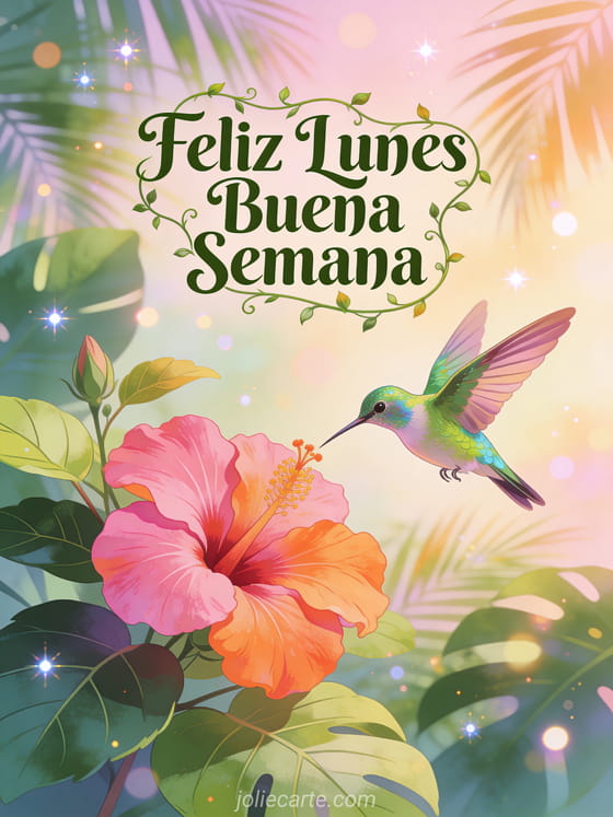 Empieza la semana con energía positiva enviando esta hermosa tarjeta de feliz lunes. Un colibrí revolotea cerca de flores de hibisco en un paraíso tropical lleno de luz. Descubre también una tarjeta de lunes positivo con cita o una tarjeta de lunes buen inicio de semana.