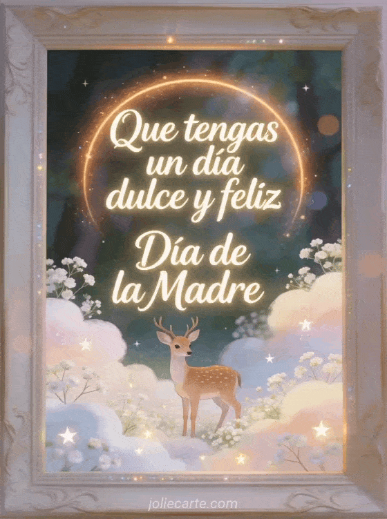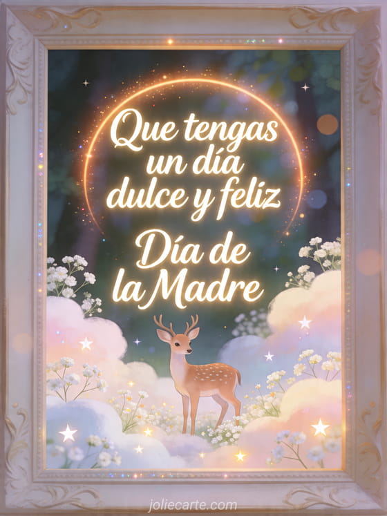 Compartan un saludo suave del Día de la Madre con una ilustración de bosque soñadora, un ciervo delicado, estrellitas y nubes de paniculata. Descubran también feliz domingo feliz Día de la Madre, tarjetas virtuales gratuitas del Día de las Madres o un mensaje para el Día de la Madre.